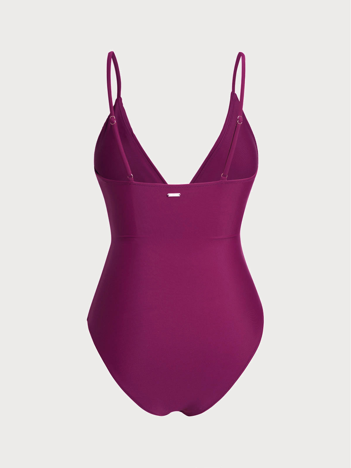 Burgundy Ruched V Neck One-Piece Swimsuit