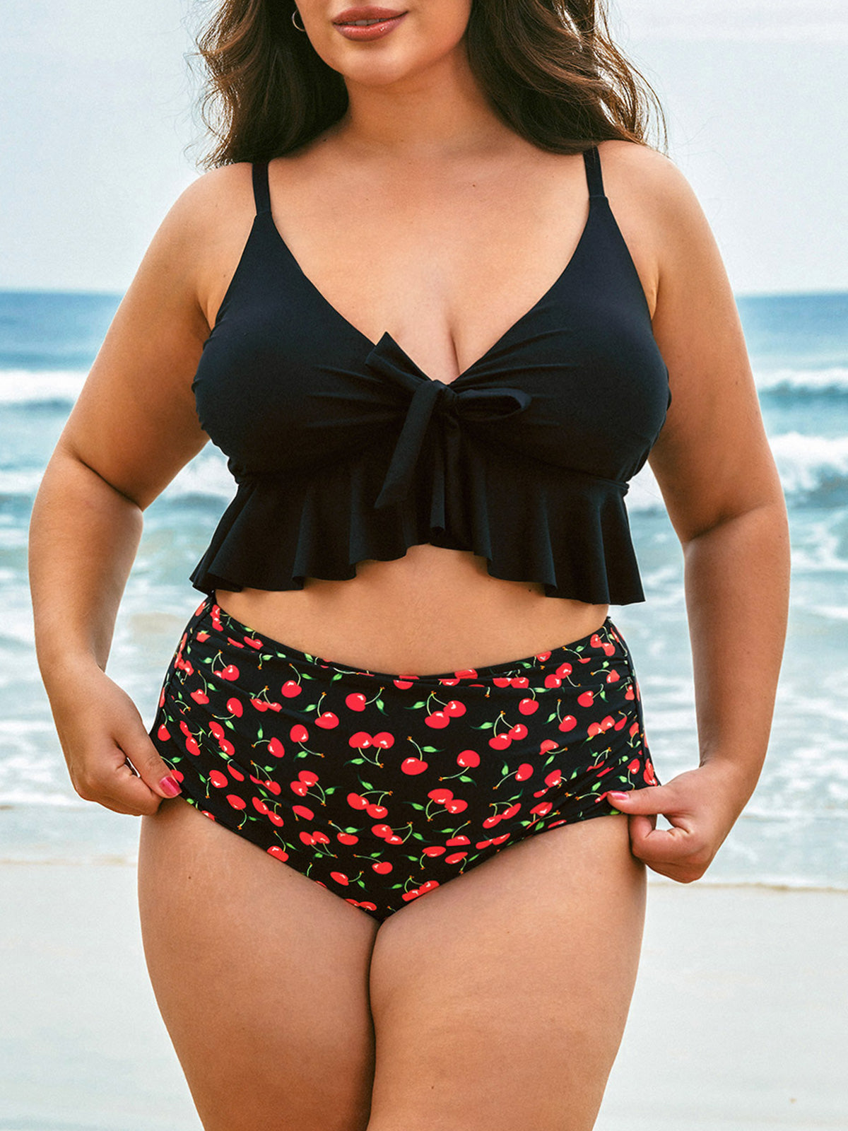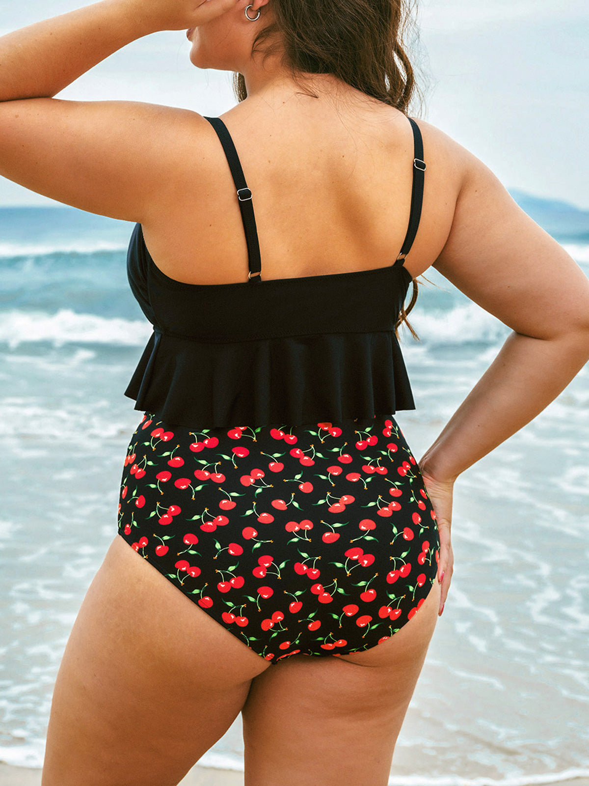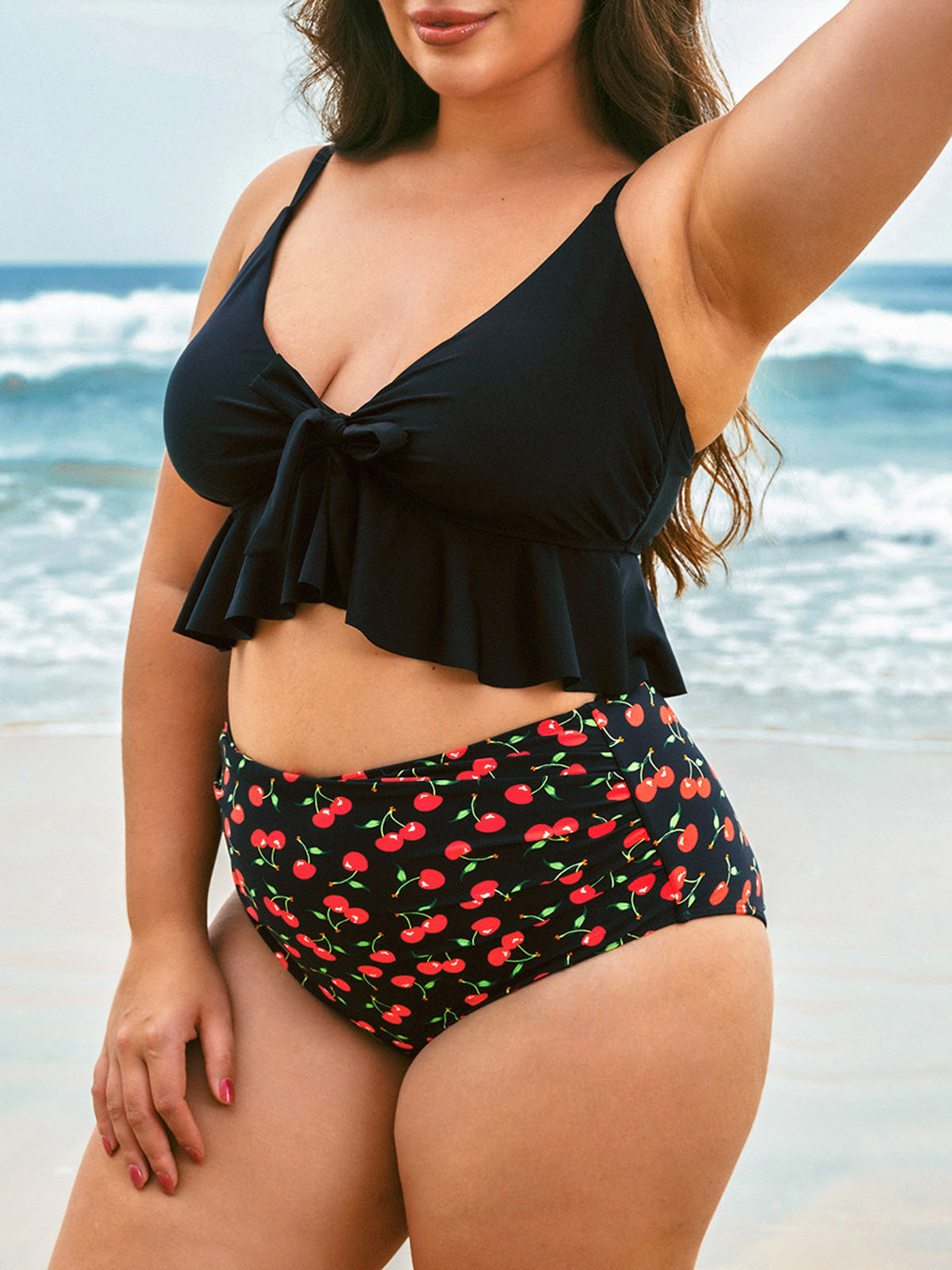Black Lace-Up Ruffled Plus Size Tankini Top