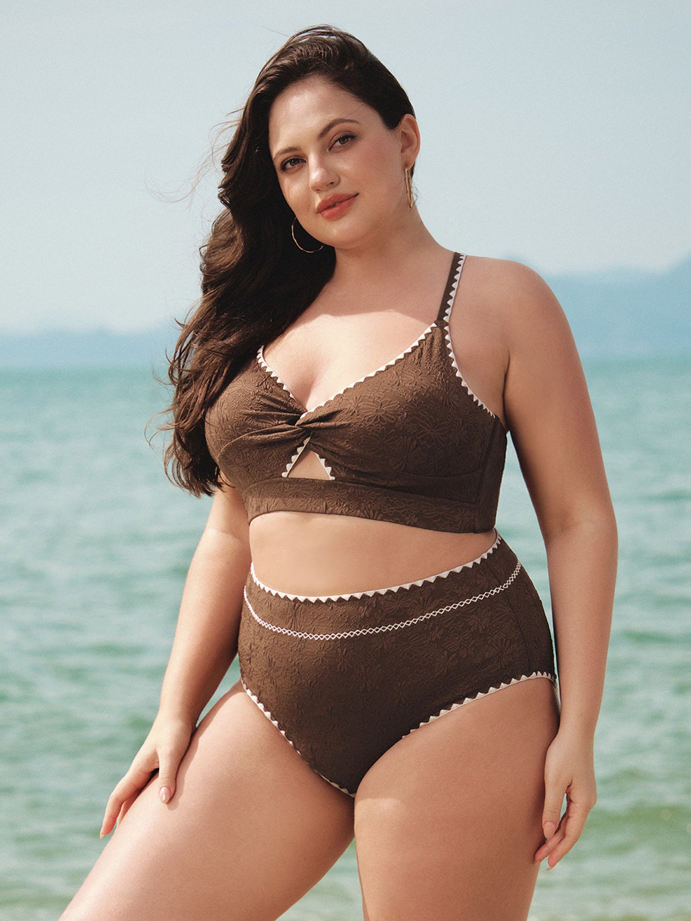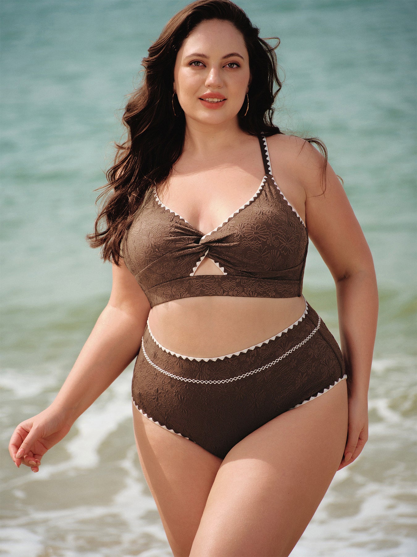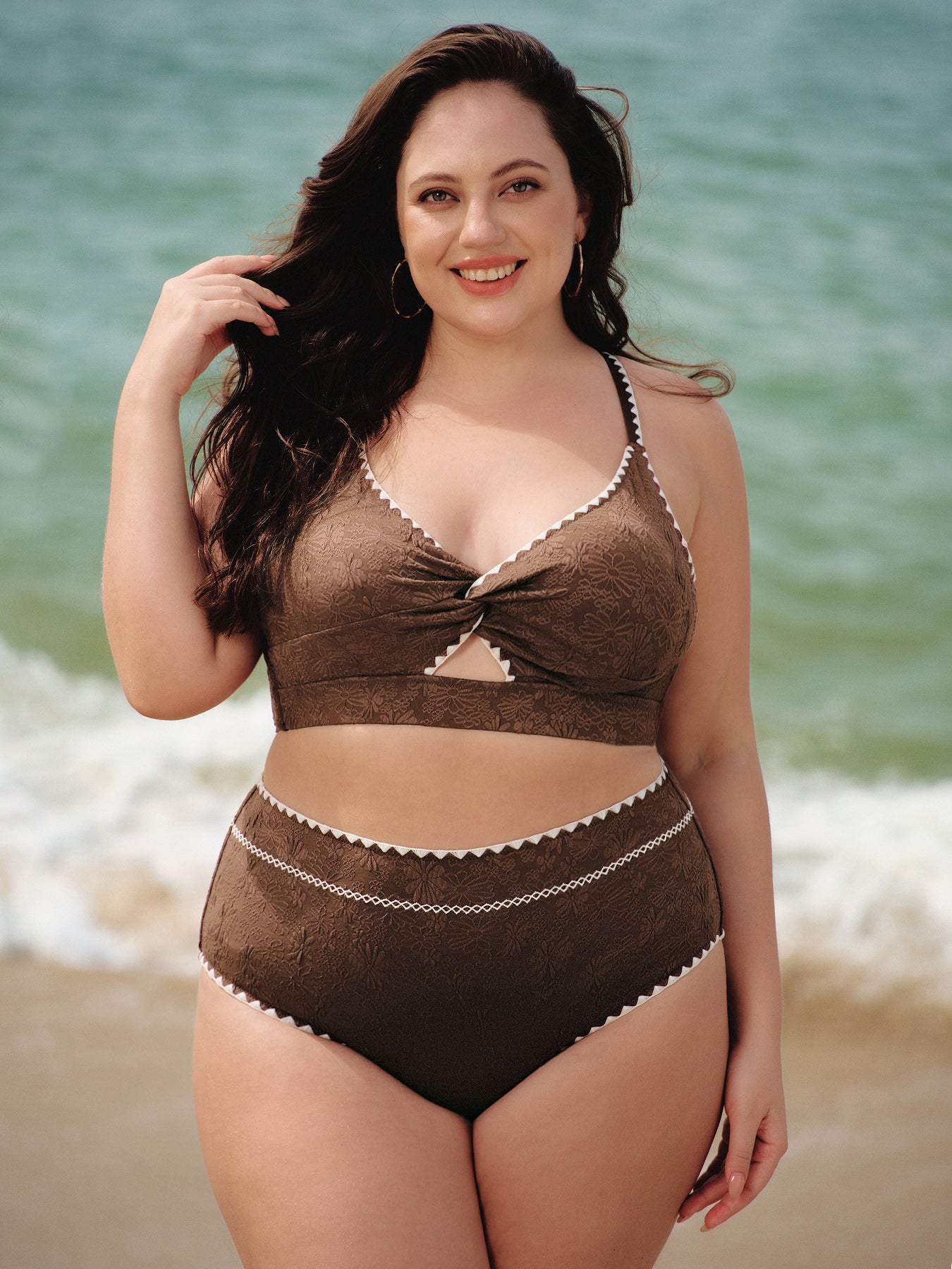 Dark Coffee Textured Cutout Plus Size Bikini Top