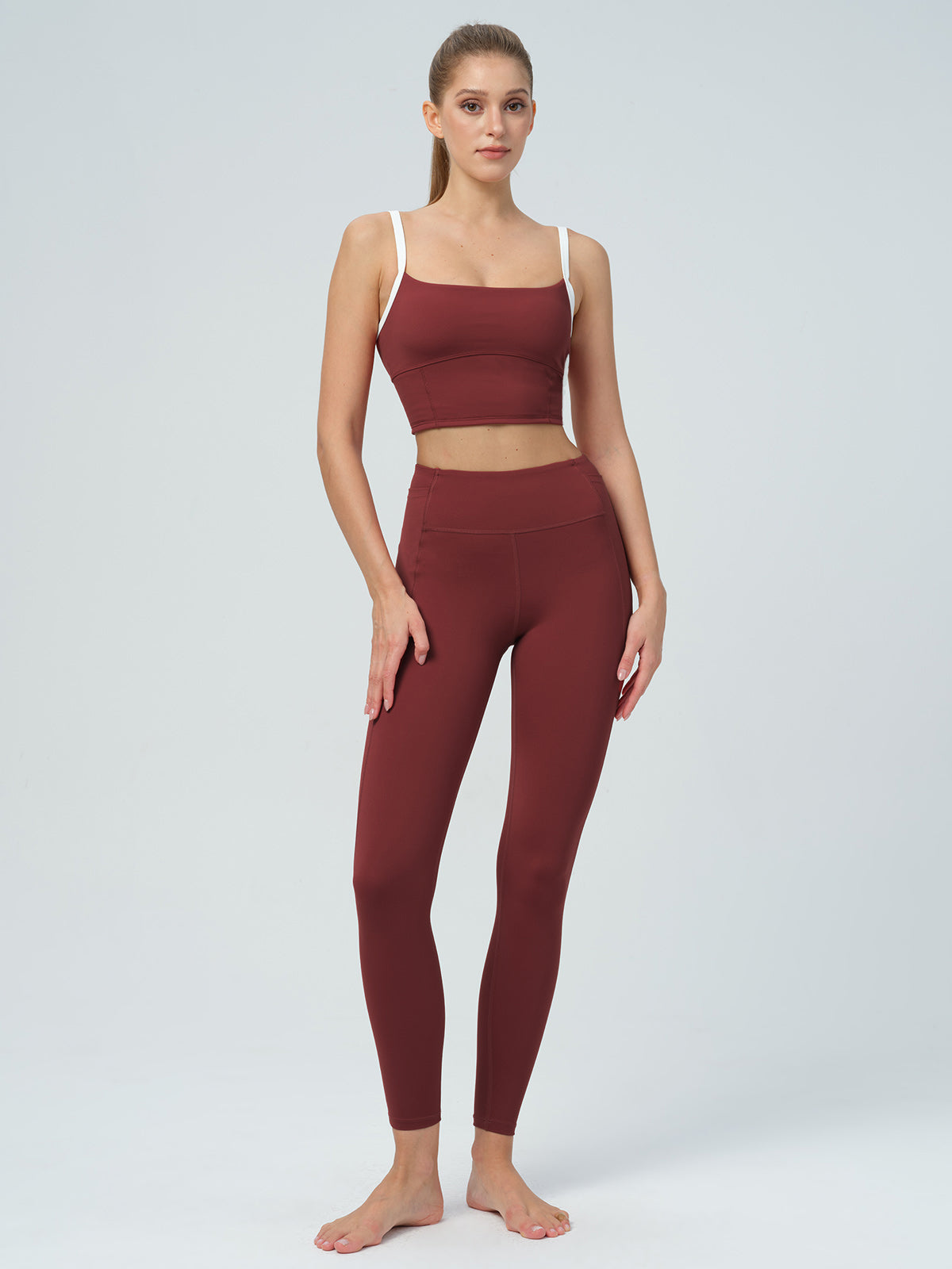 The Dark Red High Waisted Leggings 27" features GRS-certified recycled polyamide and spandex. By using these recycled materials, we lessen our impact on natural resources and minimize energy and chemical use, all while delivering top-notch performance and durability.