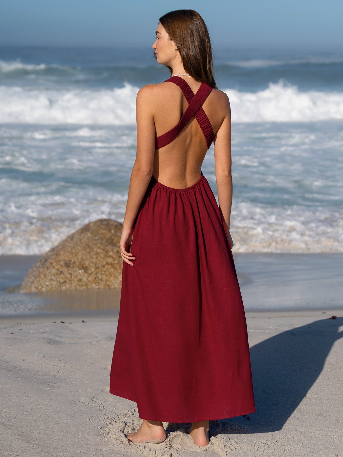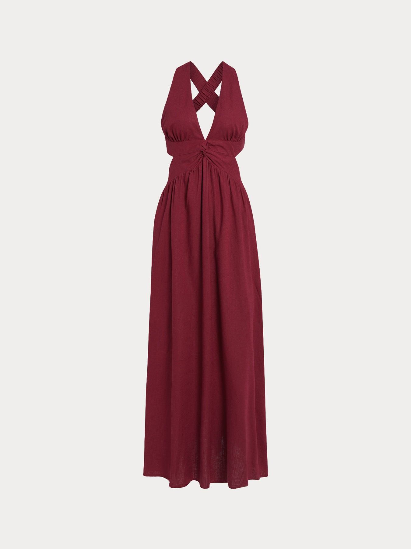 Wine Red V Neck Plaeted Beach Dress