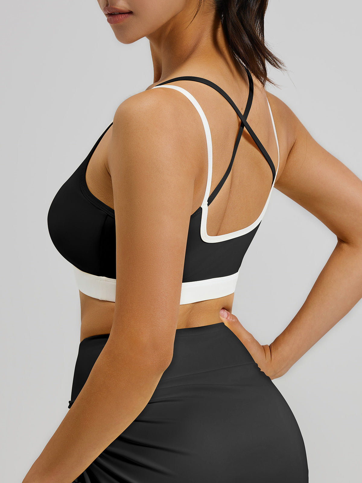 Stay supported through every move with this sleek black sports bra featuring a striking contrast cross-back design. The criss-cross straps provide both style and stability, keeping you locked in during intense workouts or casual activities. Crafted for comfort and performance, this bra combines functional support with a modern aesthetic that looks just as good as it feels. Perfect for gym sessions, yoga, or any day you want to feel confident and secure.