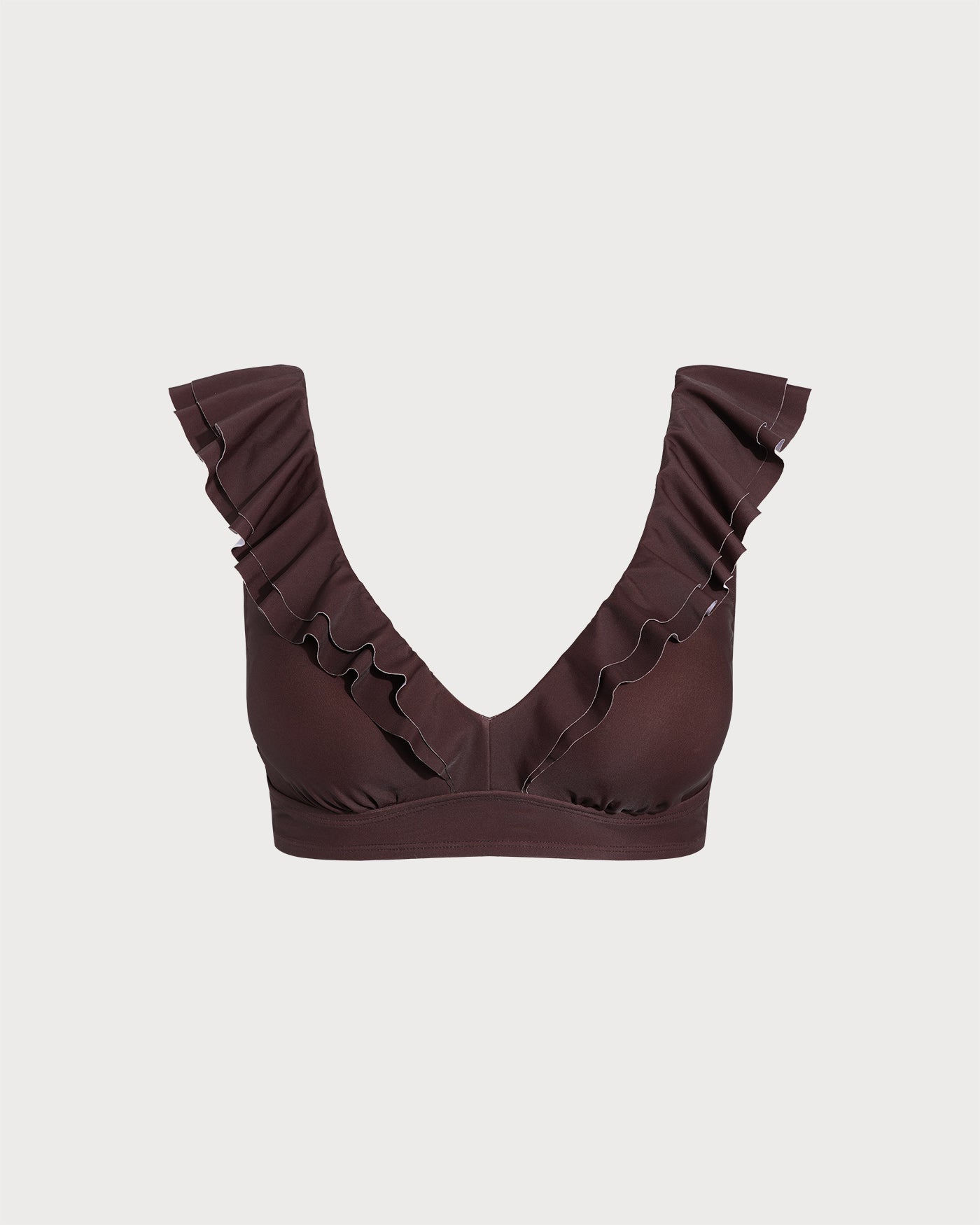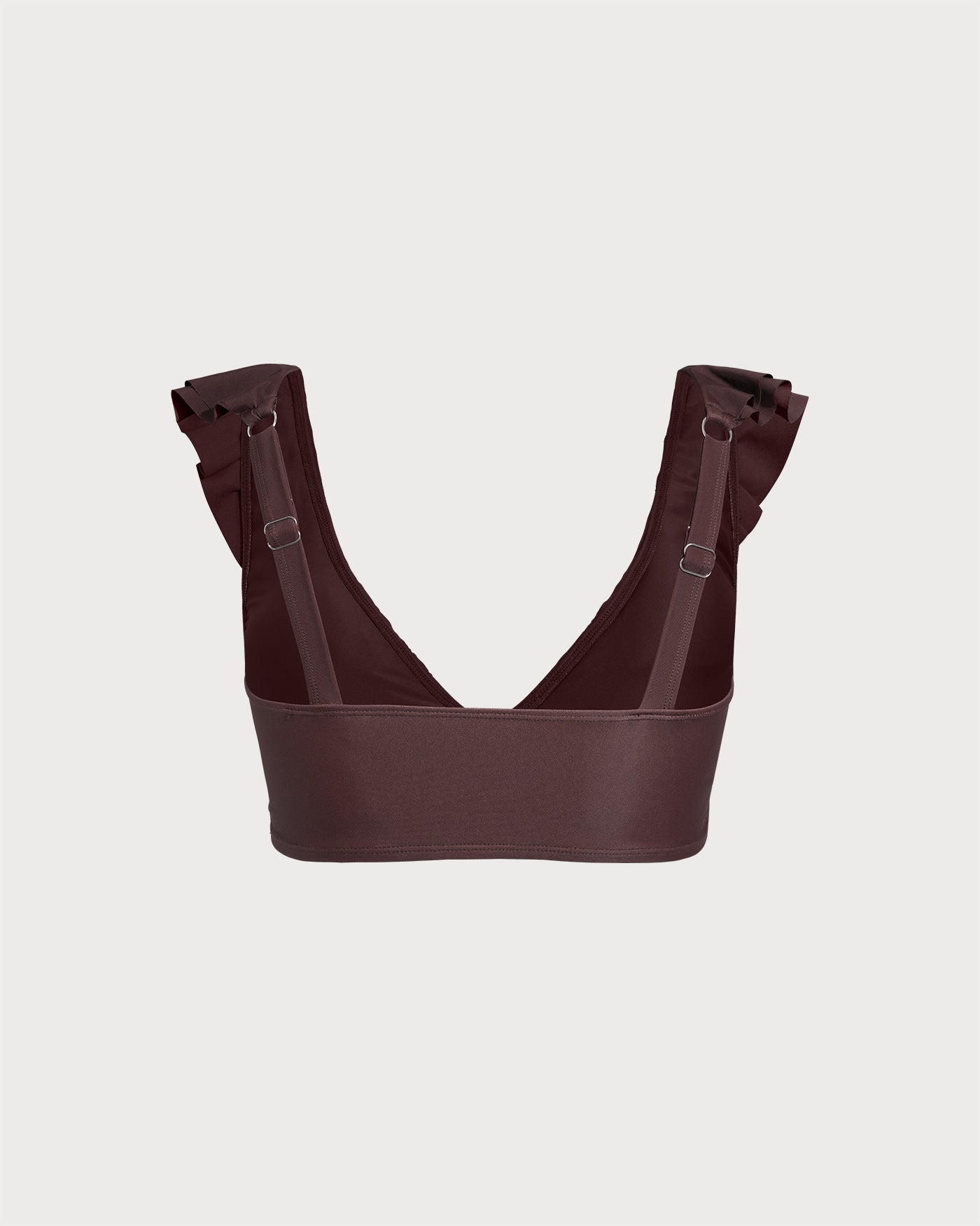 Brown Ruffled V-Neck Plus Size Bikini Top
