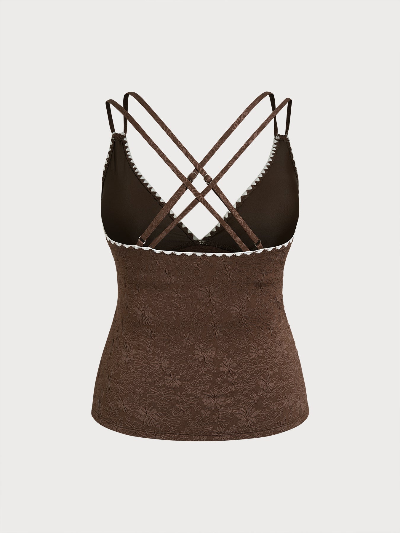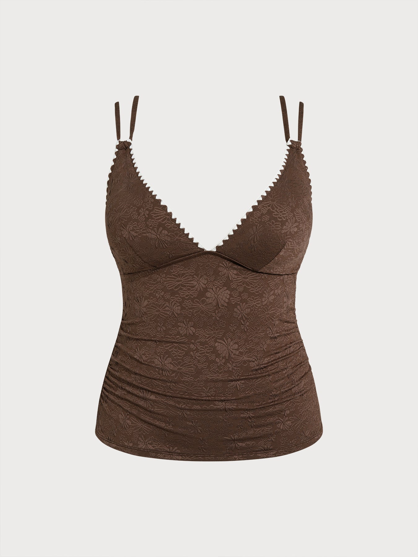 Dark Coffee Lace Ruched V-Neck Plus Size Tankini Top
