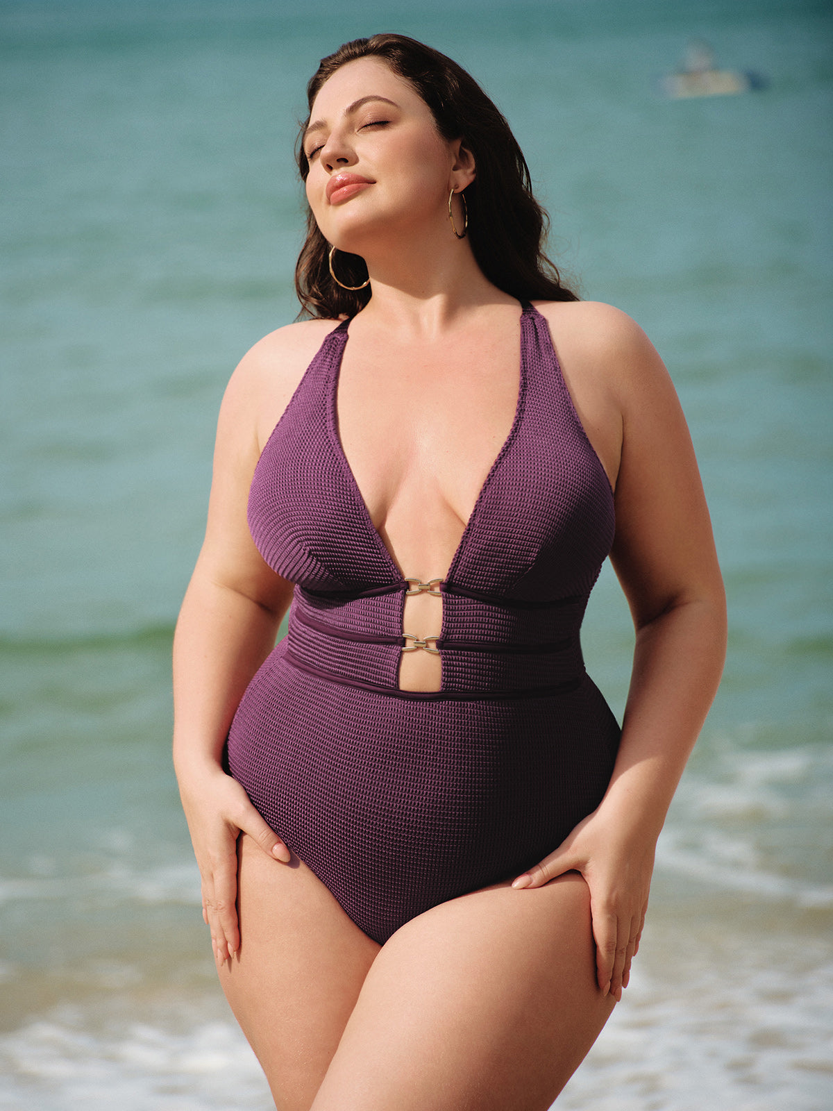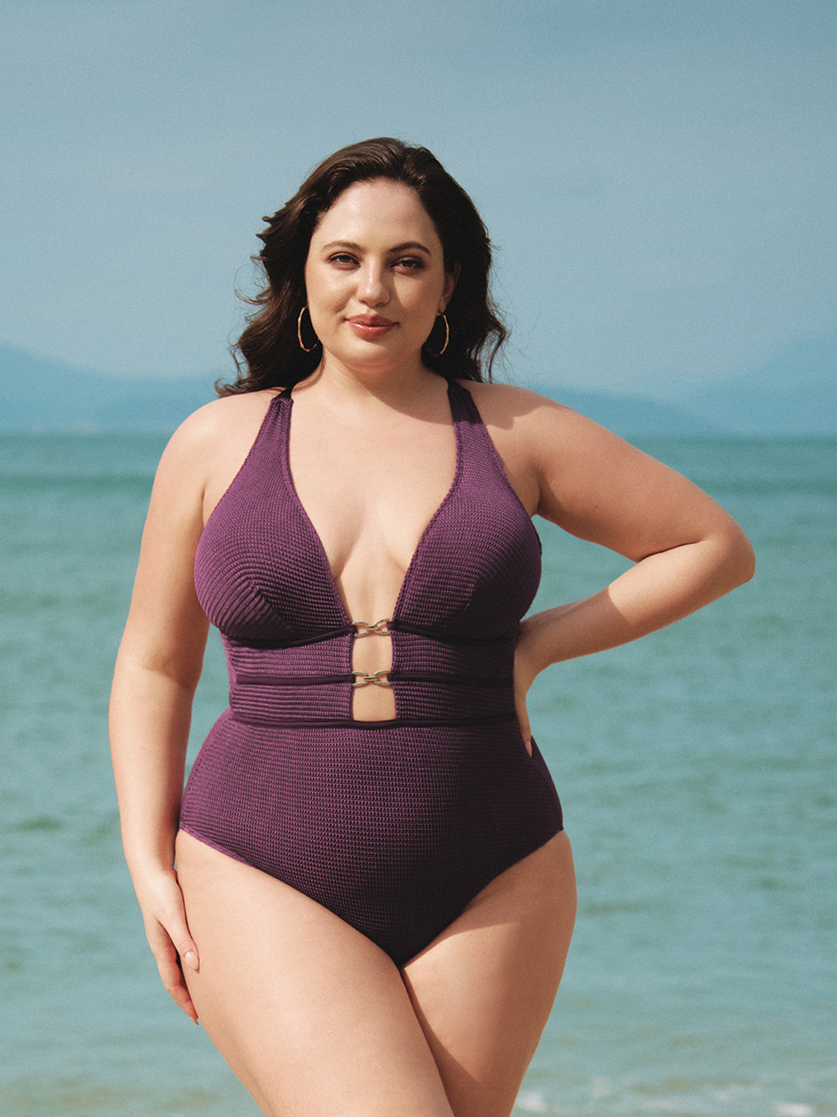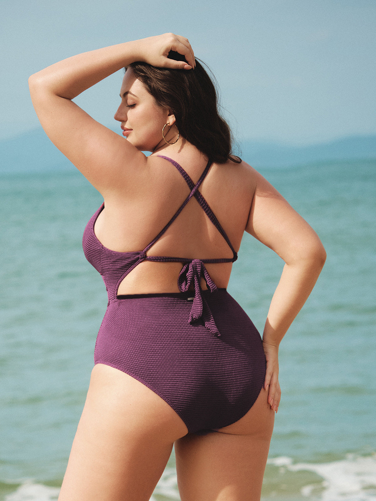 This purple textured one-piece swimsuit features a flattering V-neck design tailored specifically for plus-size figures, ensuring both comfort and style. Its textured fabric provides subtle visual interest while offering support and a smooth fit. Ideal for confident swimmers and beachgoers seeking elegance combined with a precise fit that enhances natural curves.