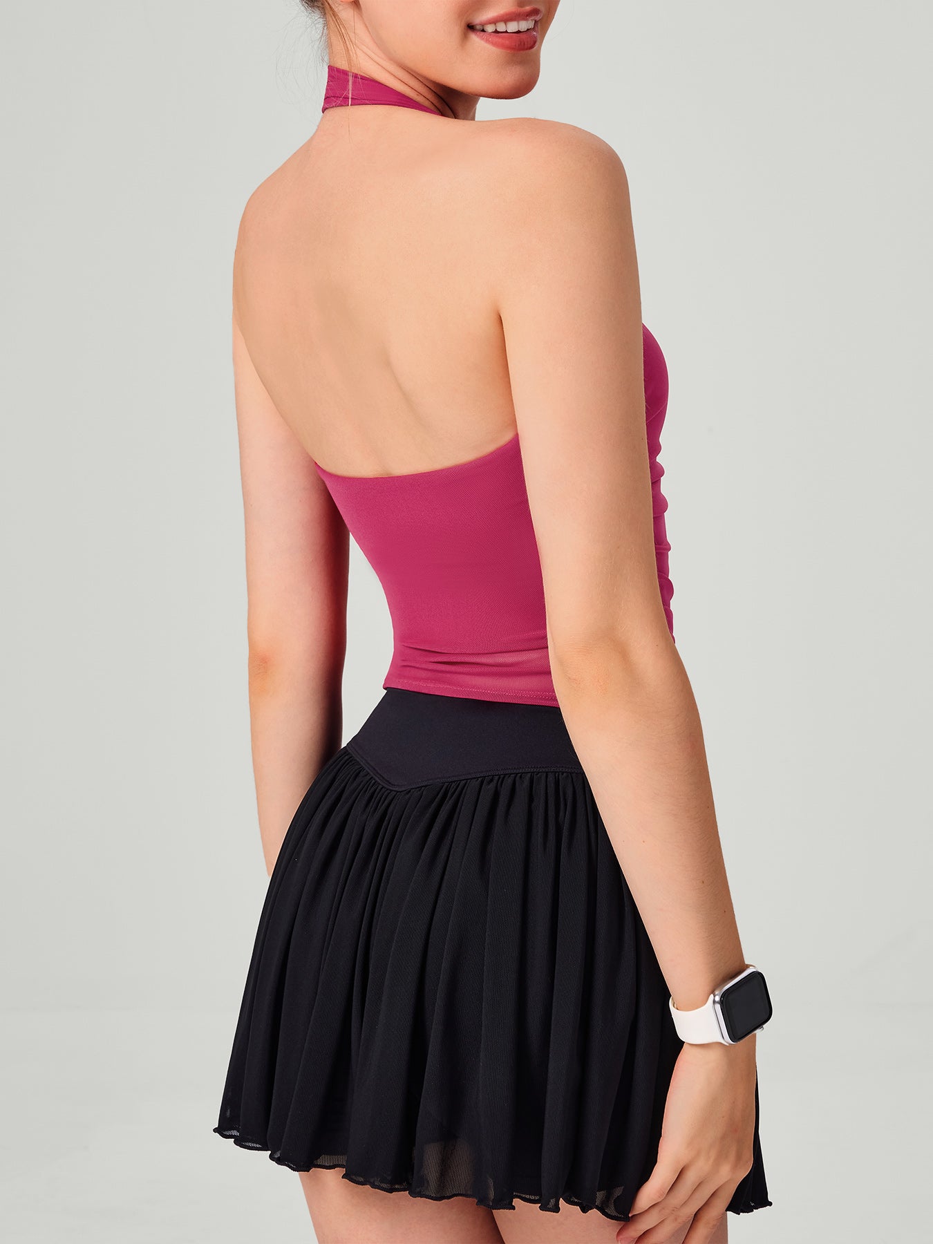 Turn heads in this flirty red crop top featuring a chic halter neckline that frames your shoulders beautifully. The ruched mesh fabric creates flattering texture and dimension, while the cropped silhouette pairs perfectly with high-waisted bottoms for an effortlessly cool vibe. Whether you're hitting the club or dressing up a casual night out, this versatile piece delivers edge with a touch of elegance. Style it solo for maximum impact or layer it under sheer pieces for added intrigue.