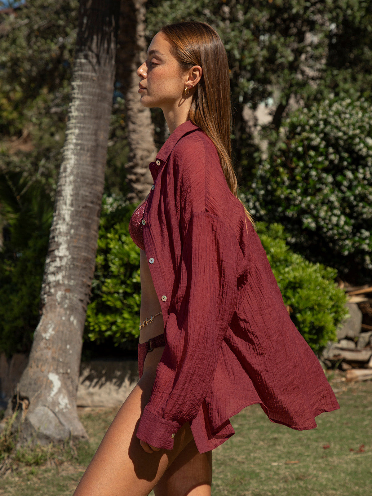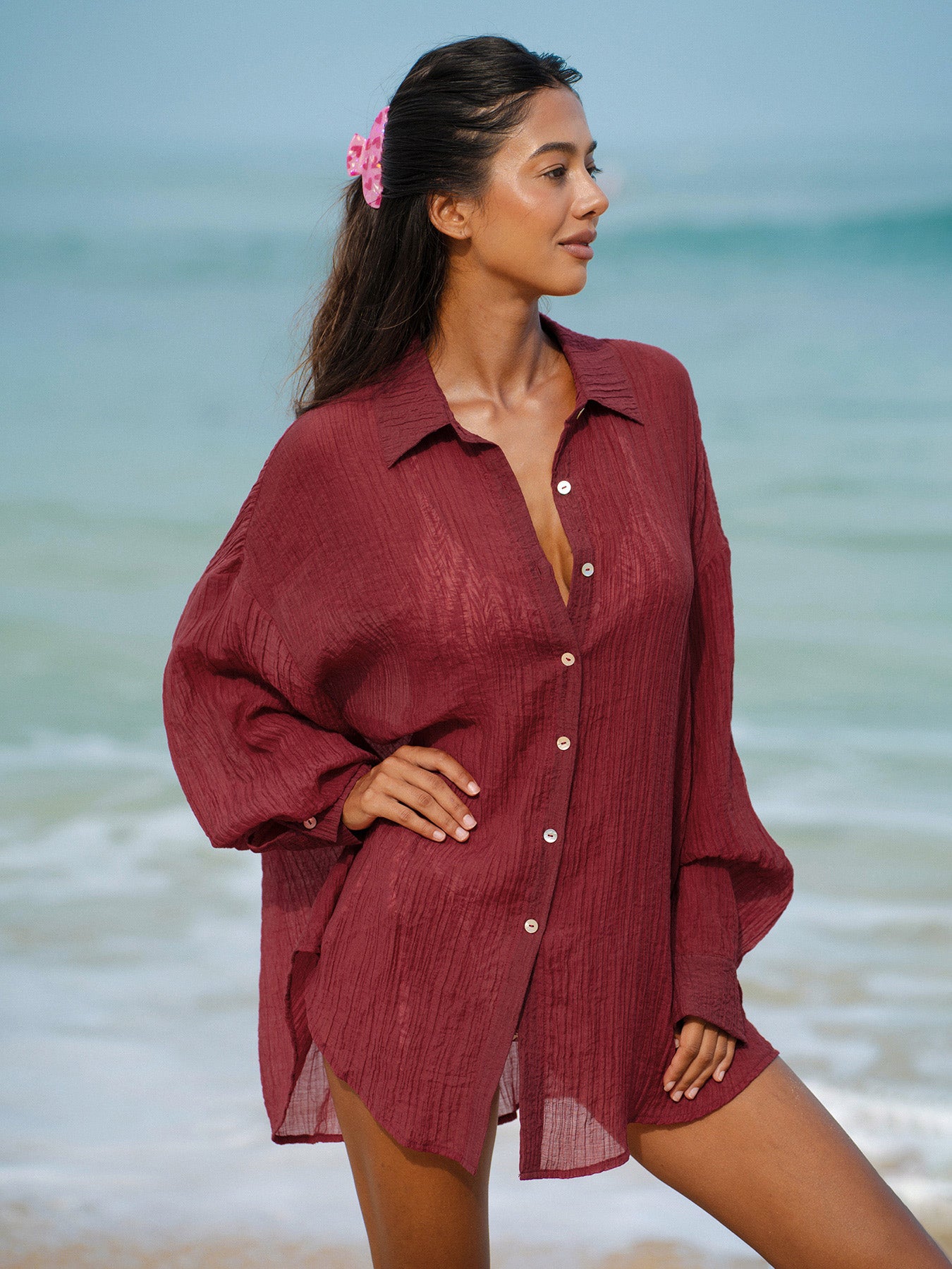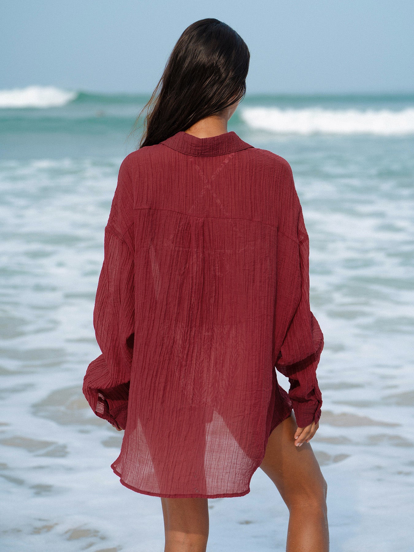 Effortlessly transition from beach to brunch in this versatile wine red lyocell cover-up shirt. Crafted from sustainable lyocell fabric, it drapes beautifully while keeping you comfortable and cool. The relaxed silhouette works perfectly over swimwear or as a lightweight layer for casual outings. Breathable, soft, and easy to care for, this wardrobe essential combines style with eco-conscious design. Perfect for warm-weather adventures and laid-back elegance.