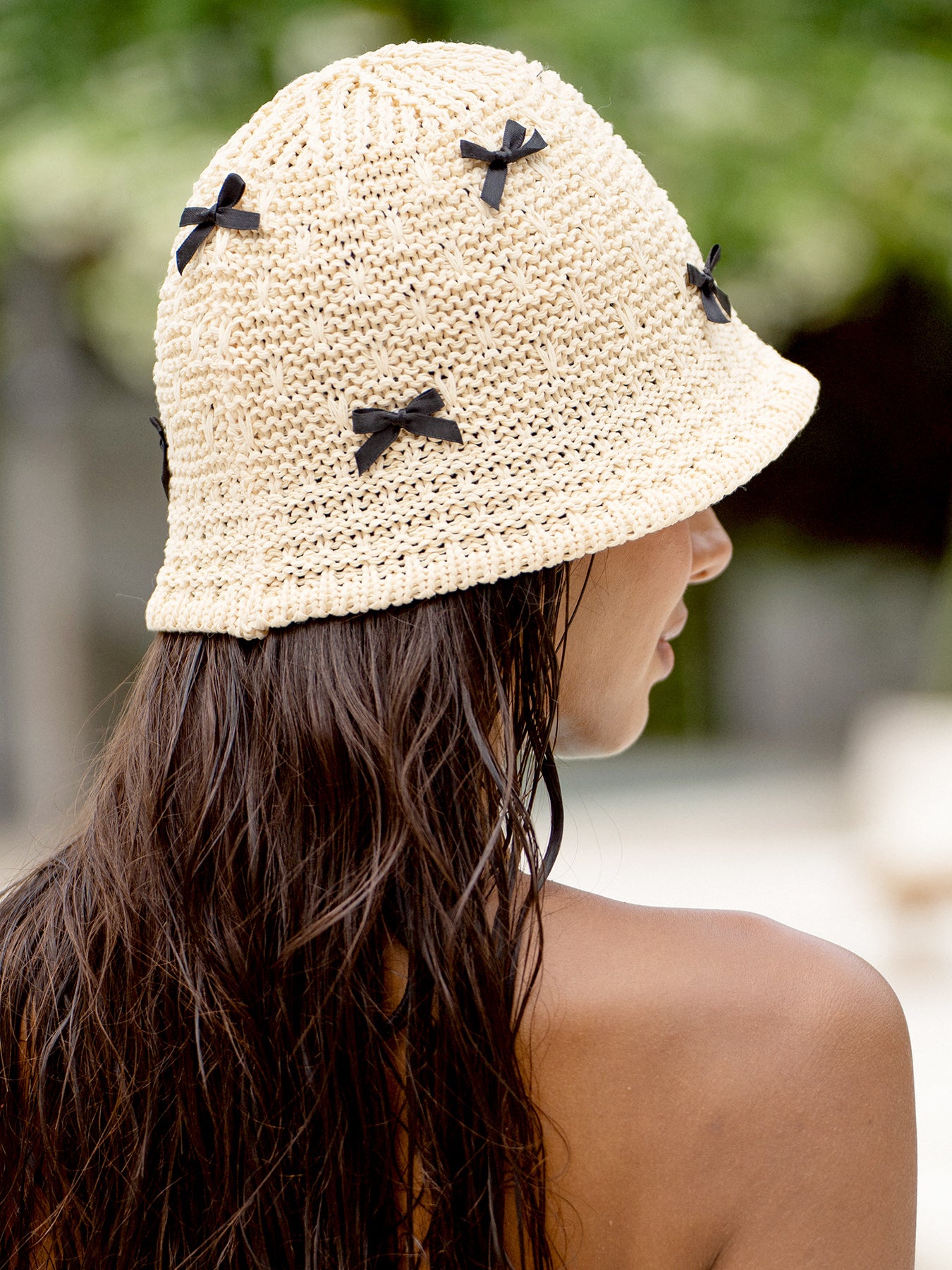 Beige Knit Bow Bucket Hat