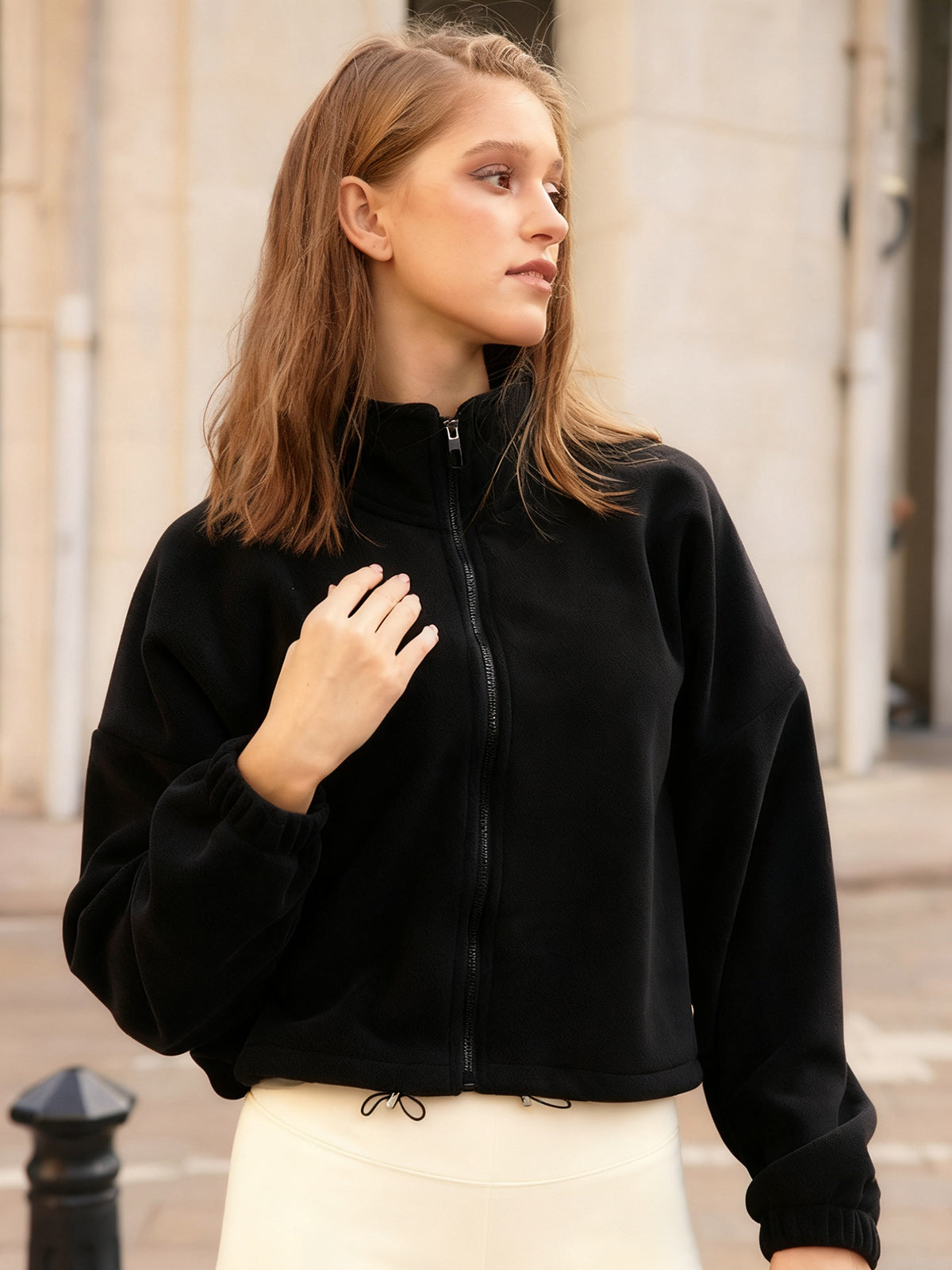 Stay cozy without the bulk! This black cropped fleece zip-up is your new go-to for layering with attitude. Perfect for post-workout vibes or casual hangouts, the soft fleece keeps you warm while the cropped cut shows off your style. Zip it up, throw it on, and own every moment—comfort meets cool in one effortless piece.
