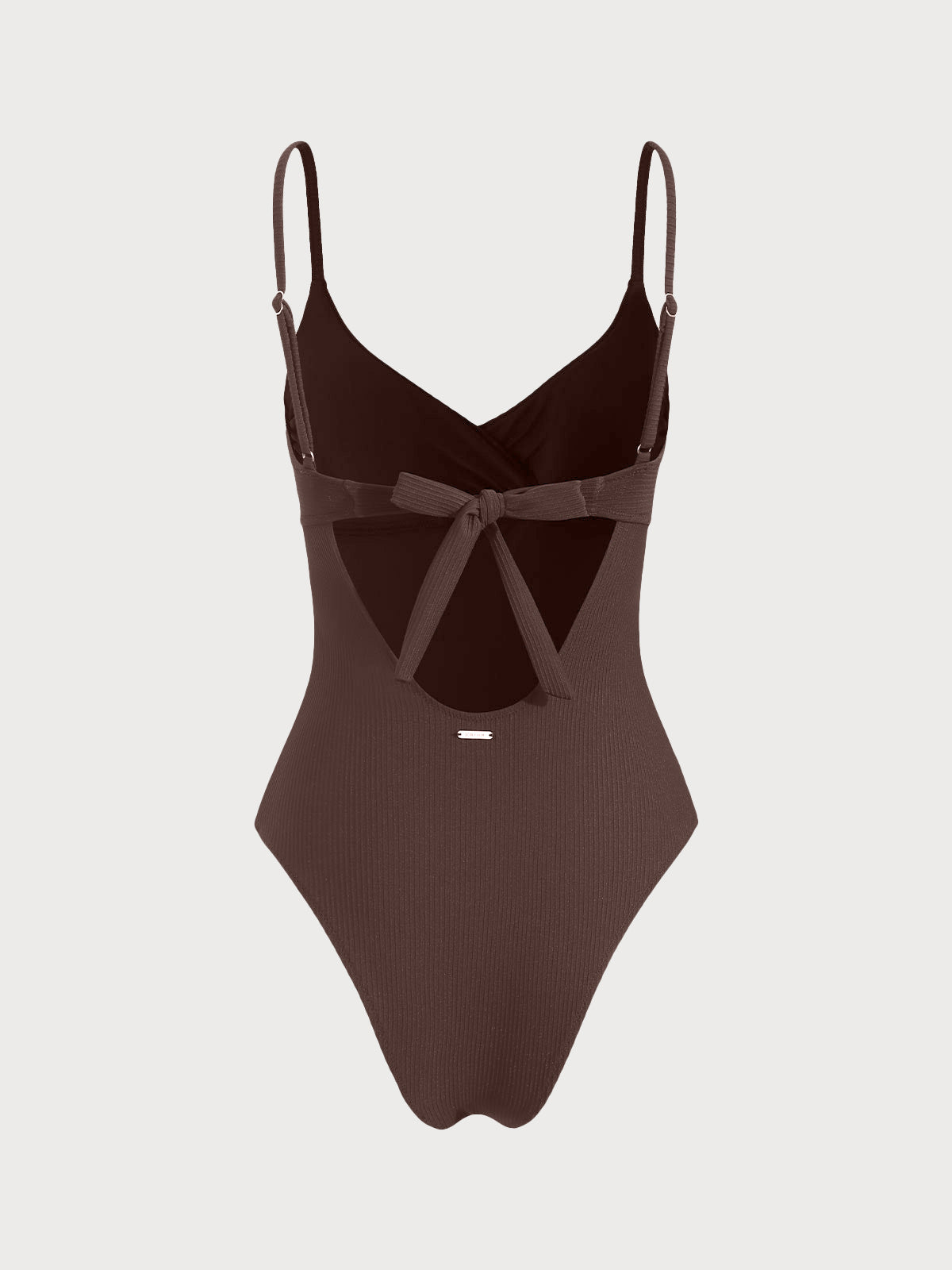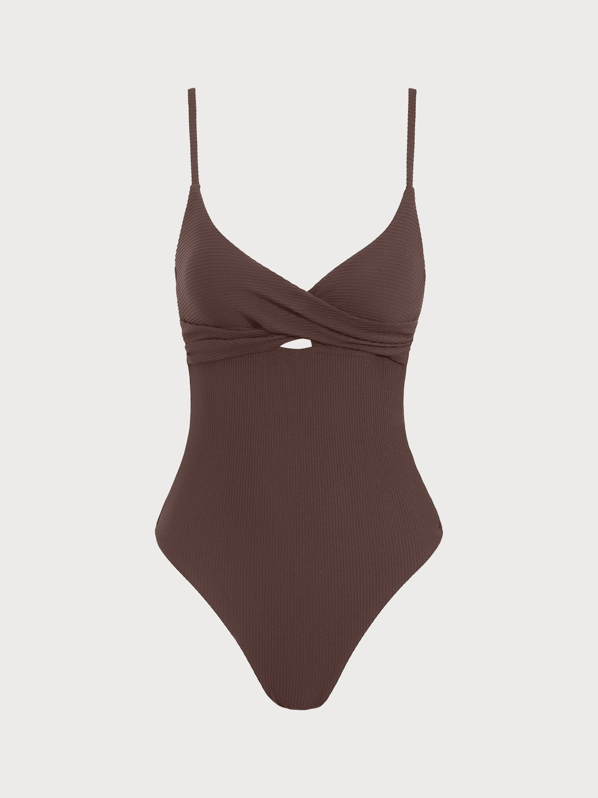 Coffee Ribbed Twist Knot One-Piece Swimsuit