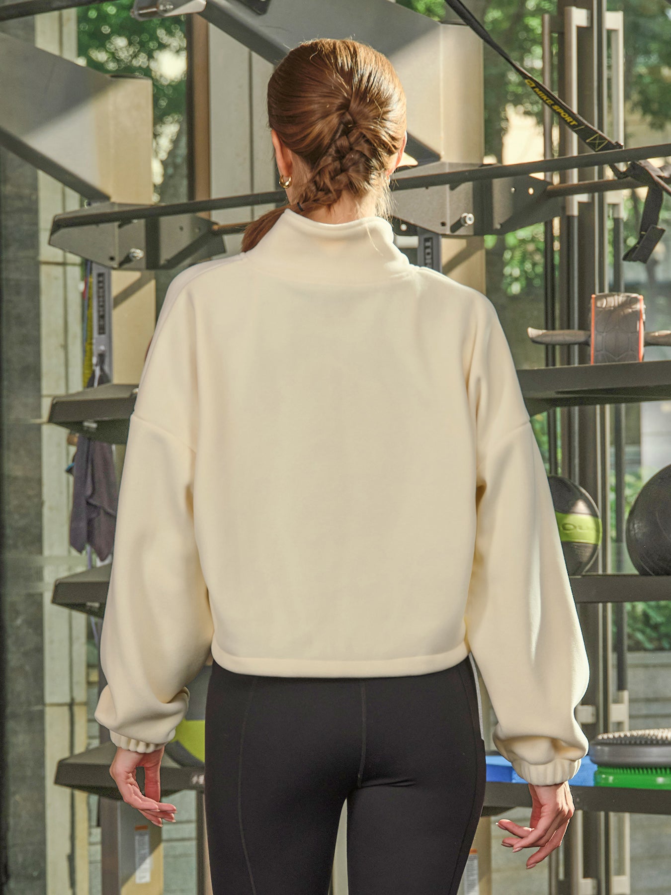 Cream Cropped Fleece Zip-Up Sports Jacket