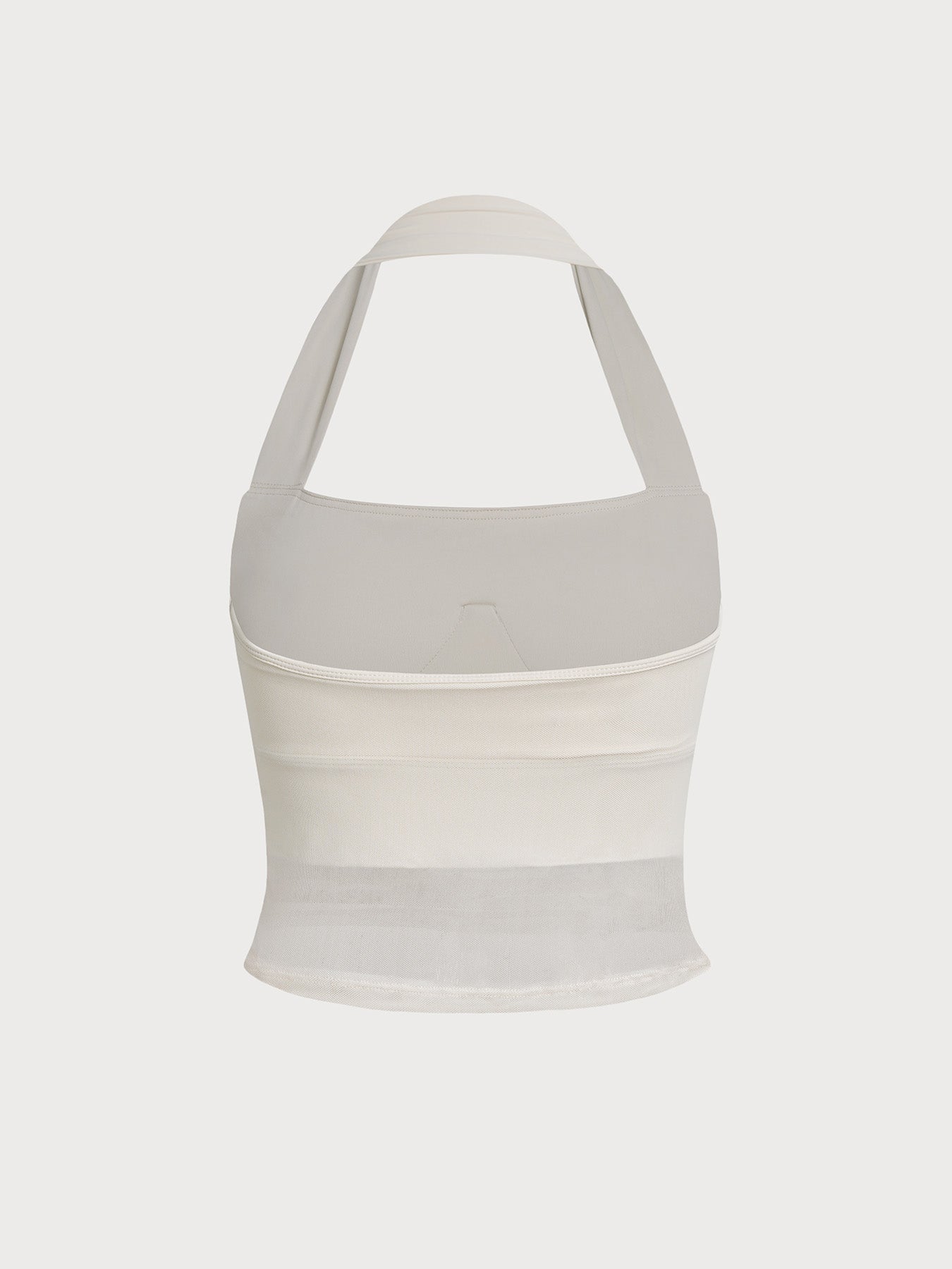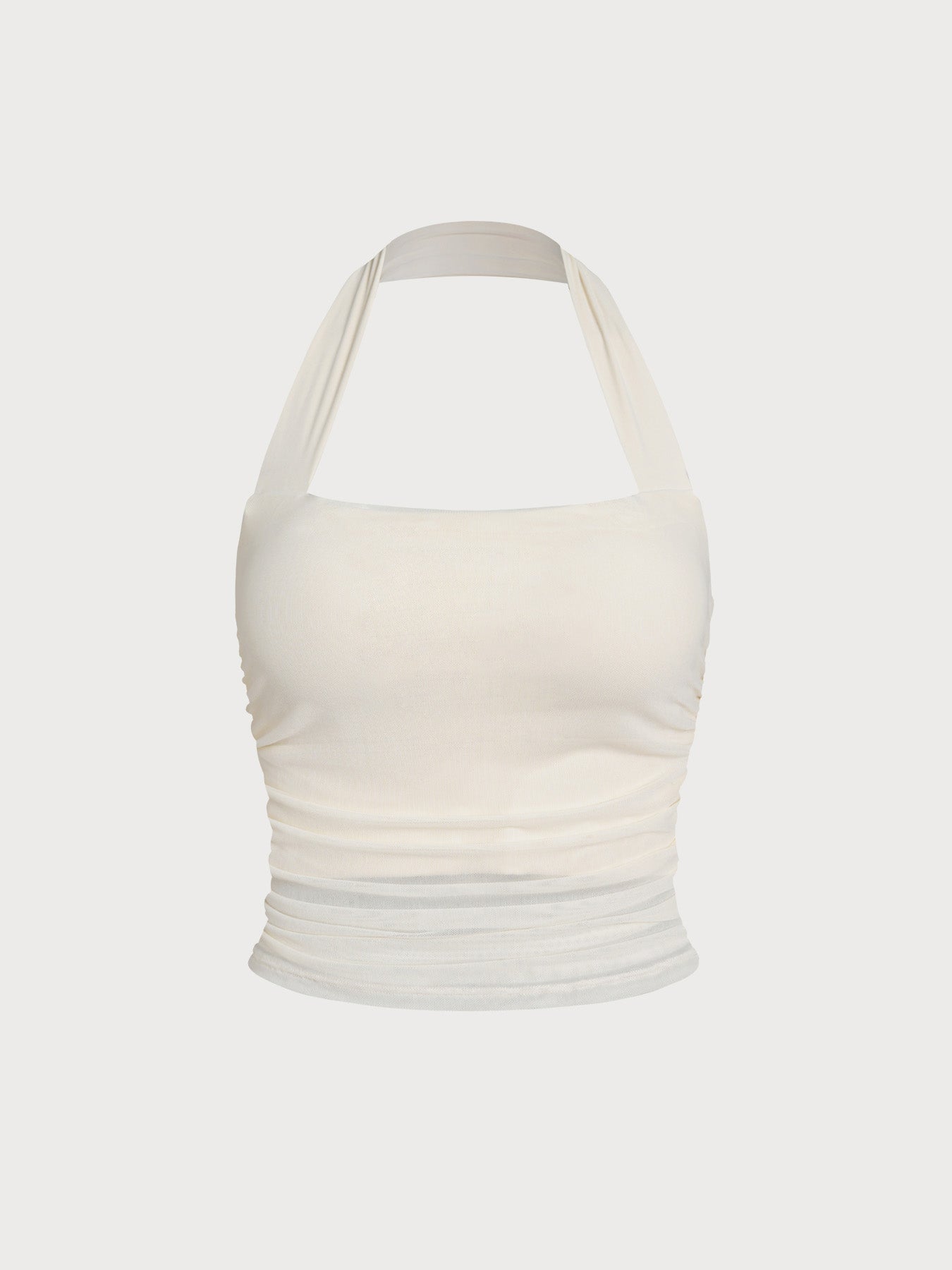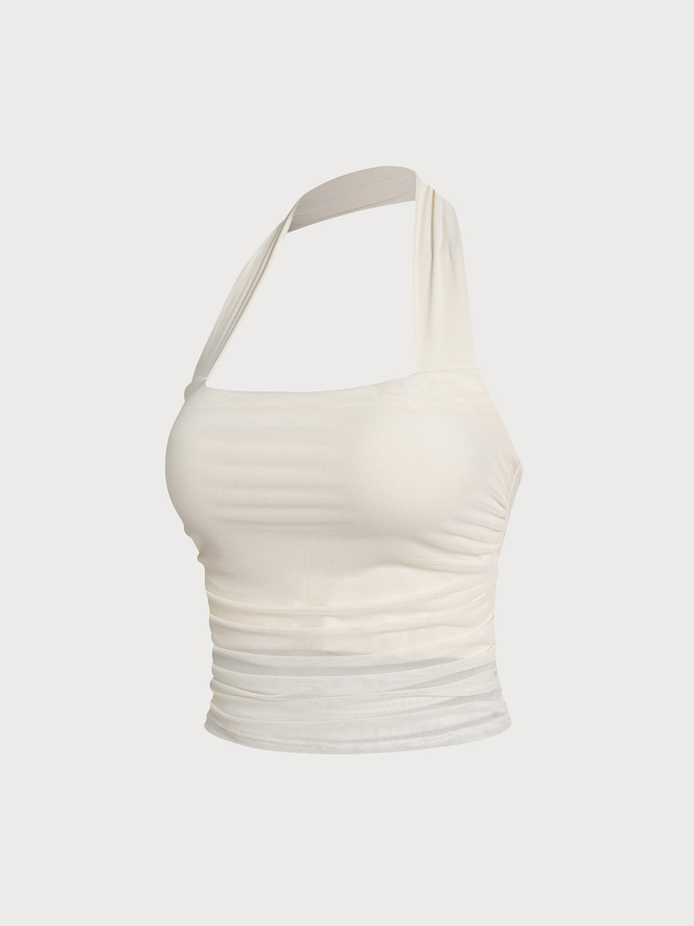 Turn heads in this flirty cream crop top featuring a chic halter neckline that frames your shoulders beautifully. The ruched mesh fabric creates flattering texture and dimension, while the cropped silhouette pairs perfectly with high-waisted bottoms for an effortlessly cool vibe. Whether you're hitting the club or dressing up a casual night out, this versatile piece delivers edge with a touch of elegance. Style it solo for maximum impact or layer it under sheer pieces for added intrigue.