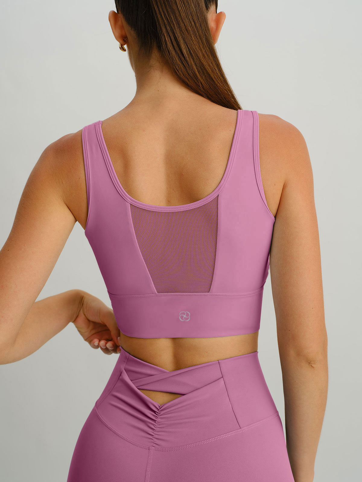 The Pink Mesh Cross-Front Tank Top features GRS-certified recycled polyamide and spandex. By using these recycled materials, we lessen our impact on natural resources and minimize energy and chemical use, all while delivering top-notch performance and durability.